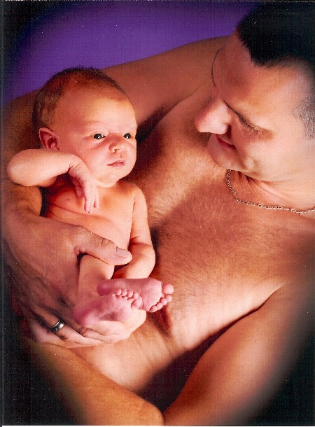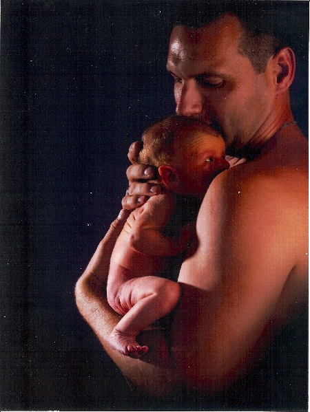 Sara's Opa Heiner starb am 23.6.-vier Tage nach ihrer Geburt. Sie hat ihn nicht kennenlernen dürfen. Auf Grund seiner Beerdigung unternahm Sara ihre erste große Reise schon mit zwei Wochen. Hier räkelt sie sich zur Beerdigungs- feier auf Papa's Schoß.