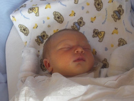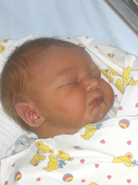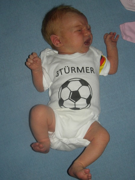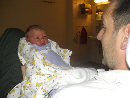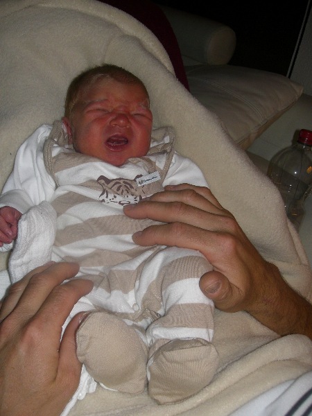wurde am 19. Juni 2010 um 23:39 mit 3420 g und 50 cm geboren. Die Geburt war unerwartet schnell (10 Tage früher als errechnet) und längst nicht so schwer wie erwartet. Im Gegenteil: den Abend zuvor noch bei Nachbars Fußball-WM schauen bis nachts 2:00, früh Einkaufen 7:00, 8:00 zurück und Torte backen und Frühstück machen, 9:30 Holunderblütensirup ansetzen und 11:00 zum Friseur. Dort dachte ich noch, ich hätte eine Magenverstimmung, die dann zu Magenkrämpfen wurde (gegen 14:00), die wiederum etwas später ziemlich rhythmisch kamen (gegen 15:00), woraufhin wir im Internet recherchiert, was Vor- oder Senkwehen sind. Ich folgte dann dem Rat im Internet: Nehmen Sie ein Bad! Wenn die Wehen danach nicht weggehen, sind es echte Wehen. Meine Haut war schon ganz runzelig, aber die "Magenkrämpfe" waren immer noch da (17:00). Während ich René bat, im Internet zu recherchieren, wie lange so Vor- oder Senkwehen andauern, machten wir Abendbrot. So gegen 18:00 stand ich über der Spüle und plötzlich...klack, klack (als würde sich ein Hebel umlegen) und es ging minimal Flüssigkeit ab. Nach einem Toilettengang meinte ich dann doch zu René, dass wir mal ins Krankenhaus fahren sollten, um zu erfahren, was das sein kann. 20:00 im Krankenhaus hieß es dann Muttermund 2 cm offen, es geht los! Ich war doch noch gar nicht so weit.... :o)