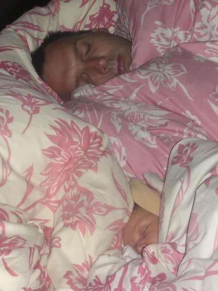 Papa und Sara kuscheln sich zusammen in die Federn. Jetzt ist sie schon fünf Wochen alt.