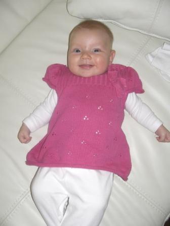 Mit ihren 11 Wochen ist sie schon ganz schön gewachsen. Hat die 6 kg-Marke überschritten und auch in der Länge so viel zugelegt, dass wir nun schon die 62/68 anziehen können und ist sie nicht zauberhaft in diesem rosa Kleid von Tante Manu? Und dieses zauberhafte Lächeln hat sie schon seit einigen Wochen drauf....man muss sie nur aus der Reserve locken und immer schön vorgrinsen und Spaß machen.