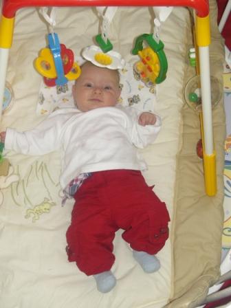 In der 13. Woche kam das ersehnte Päckchen von Oma Carmen mit dem Activity Center von Sara's Cousins Thomas und Felix und wie man sieht, ist sie ganz begeistert. Das Anstoßen passiert zwar noch eher zufällig - macht aber trotzdem einen Heidenspaß!